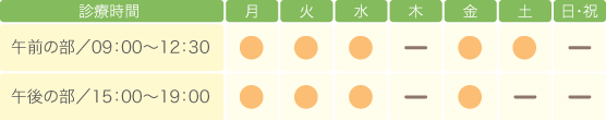 【平 日】午前/09:00~12:30 午後/15:00~19:00